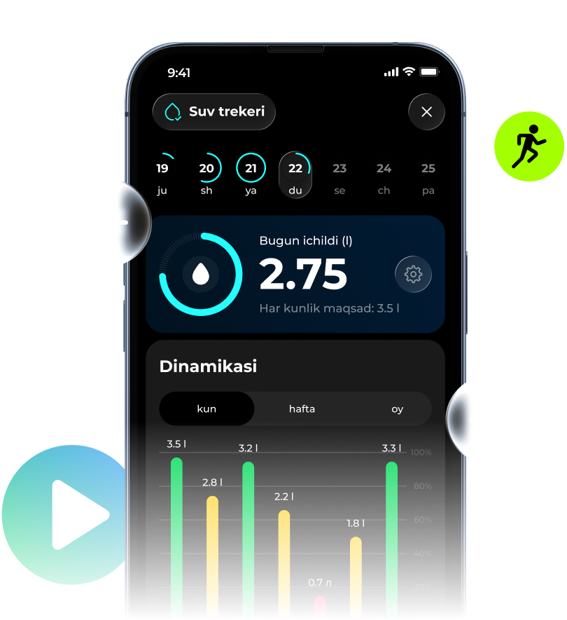 Kundalik suv me'yori sizning ma'lumotlaringiz asosida individual ravishda hisoblanadi
